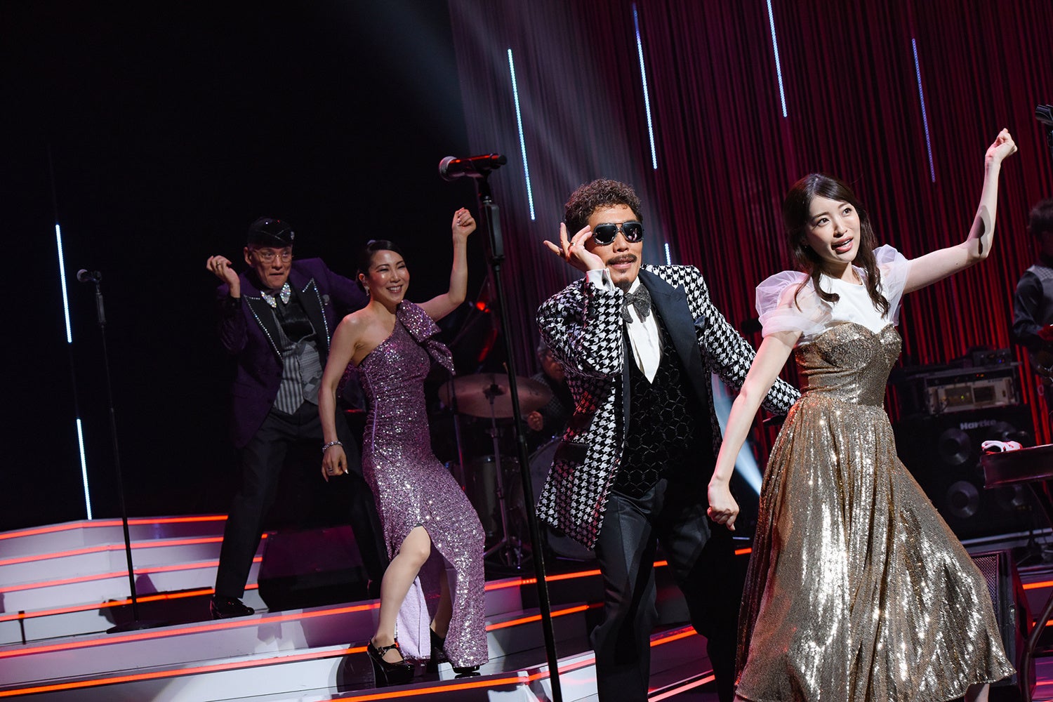 場内アナウンスが観客のテンションを煽るように“KING of LOVE SONG MASAYUKI SUZUKI!”と声高らかに呼び込むと、紫色の怪しげな照明に照らされた鈴木雅之の姿が! キングの名にふさわしく、ステージの一番上に堂々と立ち誇るその姿を見ただけで客席からは歓迎の拍手が大きく鳴り響く。1曲目は「怪物」(YOASOBI)、原曲とは雰囲気をガラリと変え、ぐっと色香が漂う歌唱で観客を心酔させていく。ビートが強くなるたびに鈴木の歌声はより迫力を増し、ステージ後方にある紗幕に彼のシルエットが色濃く映る。視覚からも攻め込んだムードたっぷりの演出に客席からは感嘆の声が漏れ聞こえる。かと思えば、「エイリアンズ」(KIRINJI)ではステージに腰掛け、リラックスしたステージを披露。原曲は低音から高音まで幅広く動き、メロディの構成も複雑な楽曲だが、ヴォーカリスト・鈴木雅之の手、いや声にかかればもうそこはあっという間に彼の世界だ。