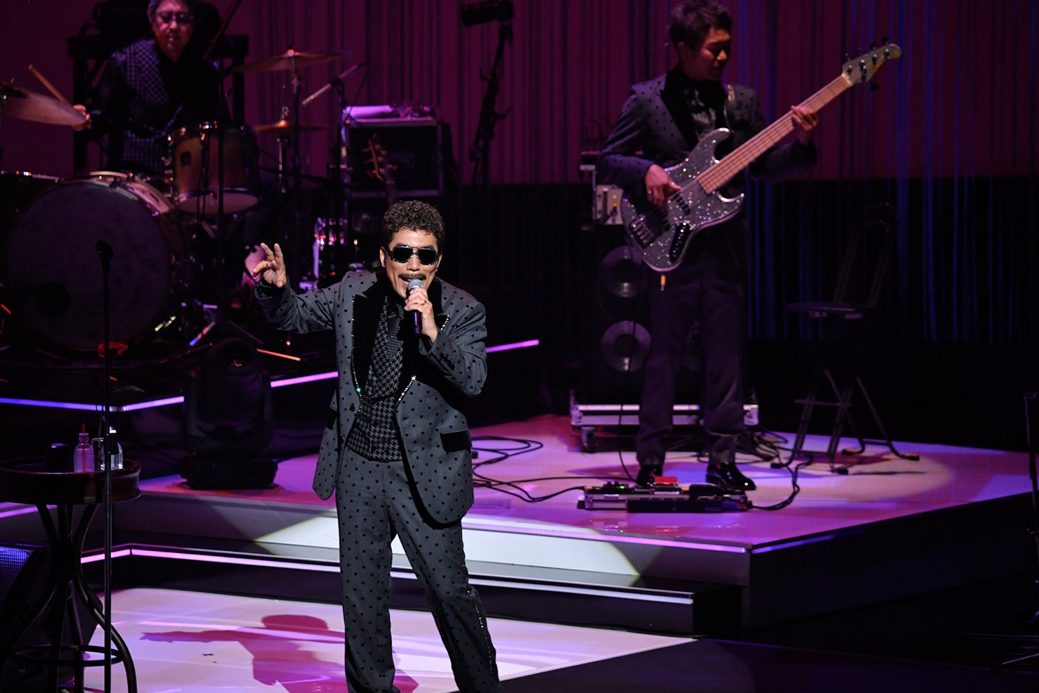 「木蘭の涙」(スターダスト☆レビュー)、“逢いたくて”と優しい歌声でそっと寄り添うように歌う。トレードマークのサングラスに眩い照明があたり、まるで涙に光が灯るようだ。続く「愛し君へ」(森山直太朗)ではよりエモーショナルな歌声で観客を圧倒。ヴォーカリストとしての魅力をこれでもかと魅せつけていく。