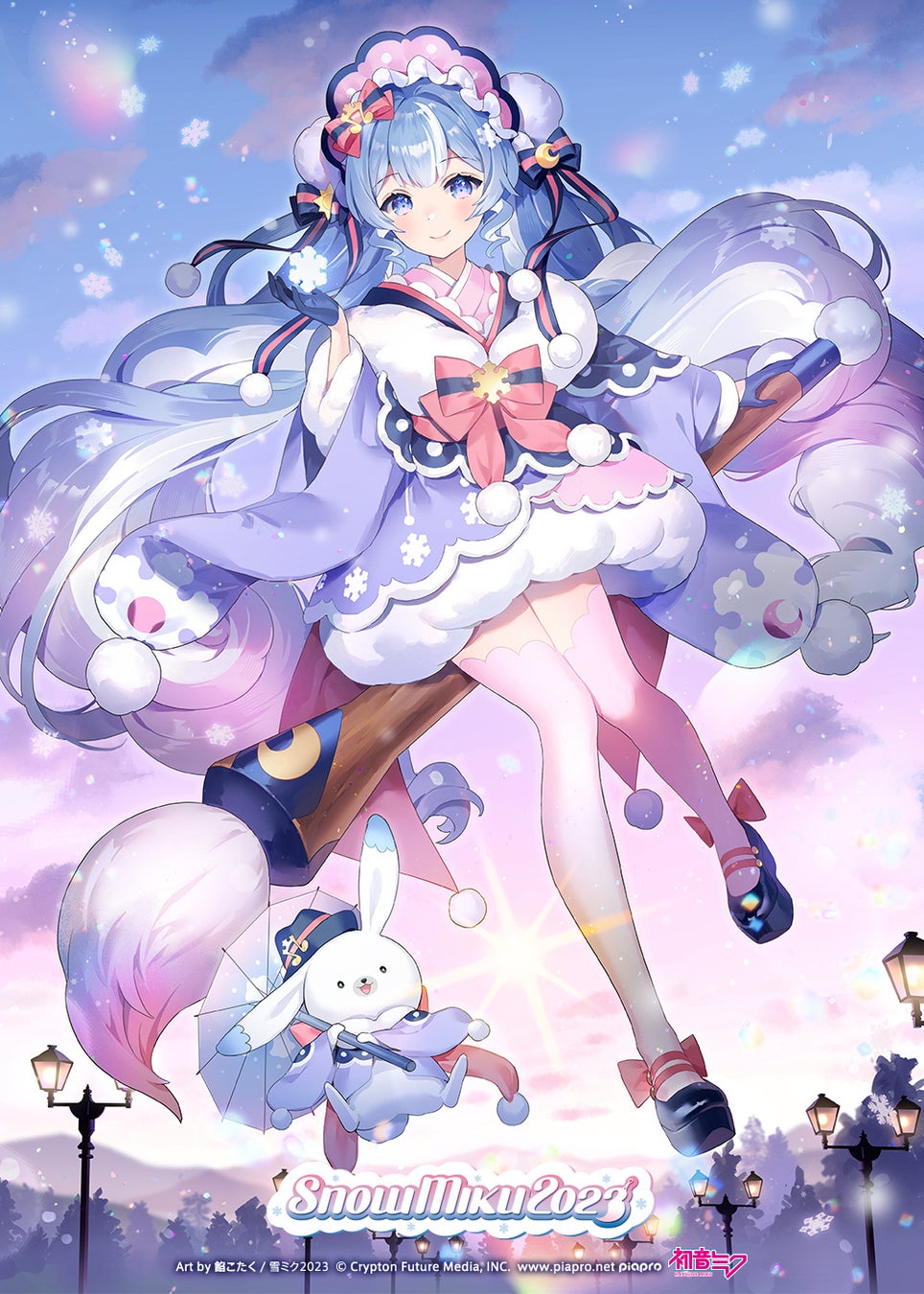 メインビジュアルを手掛けたのはイラストレーターの餡こたくさん。「北海道の冬をイメージした“空模様”」をテーマに一般公募で選ばれた、Isakytmさんの衣装デザインを元にご制作いただきました。幻想的な灯りが灯る夜明けの空を背に、優しく微笑む雪ミクとラビット・ユキネが描かれたビジュアルです。