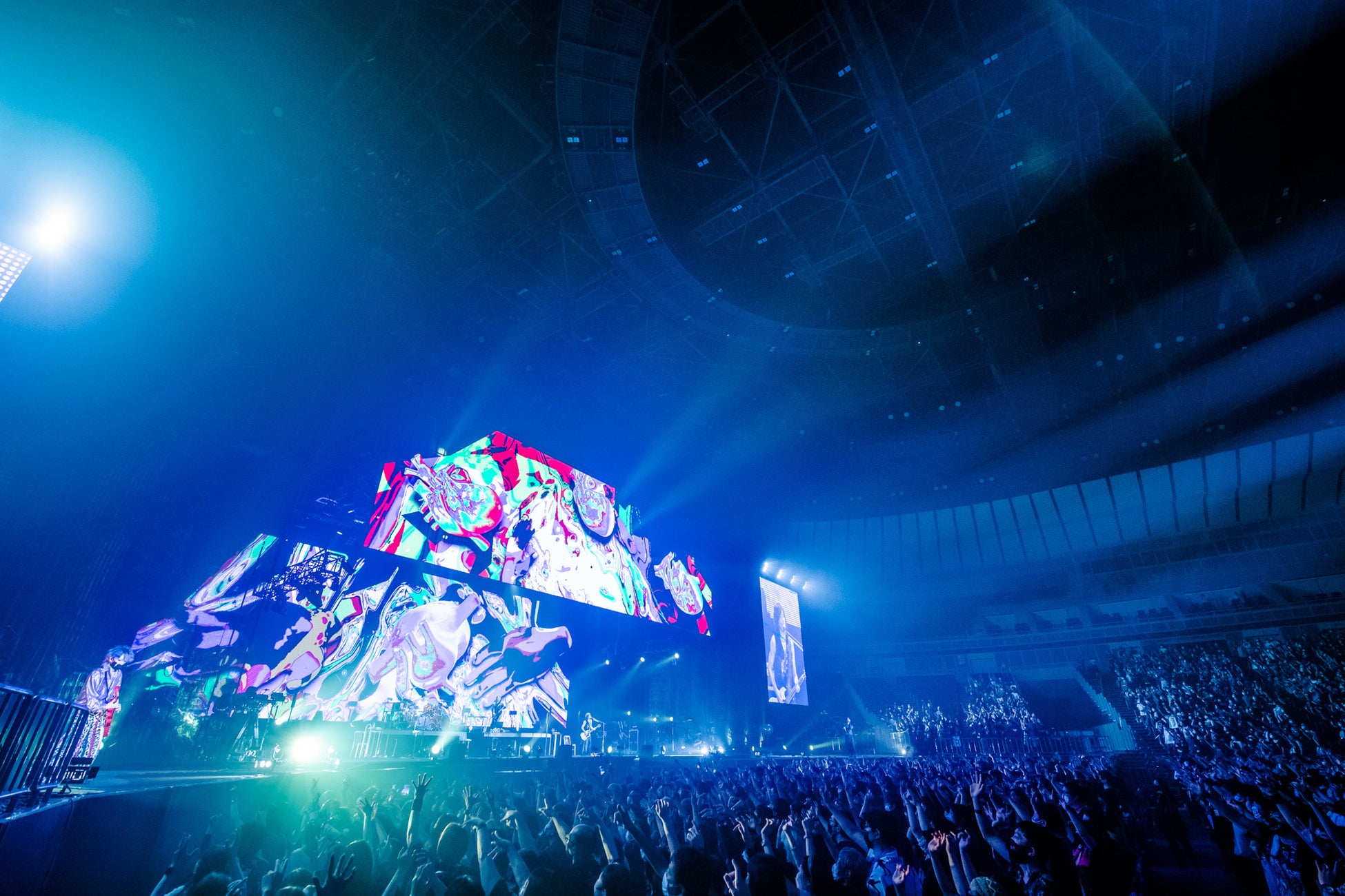 樋口豊(Ba)樋口豊(Ba)「New World」で本編を終えると、アンコール第一部ではメジャー3rdアルバム『TABOO』から「ANGELIC CONVERSATION(2022MIX)」を披露。光が天に昇っていくようなLEDスクリーンの眩い演出と、ステンドグラスから日が差し込む荘厳な教会の映像に息を吞み、厚く折り重なりながらも決して音が濁らない美しいアンサンブルに聴き惚れた。純白から漆黒へと転じるように、「惡の華」はとことんダークに疾走。そして、生も死も喜びも悲しみも、すべてを包み込んで浄化するような「HEAVEN」でピースフルに幕を閉じた。