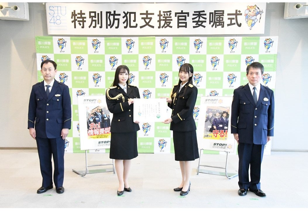 この度、特別防犯支援官のSTU48が、香川県警察本部で特別防犯支援官の再委嘱を受けました。再委嘱式にはSTU48から川又あん奈支援官、福田朱里支援官が出席し、委嘱状の受領と決意表明を行いました。
