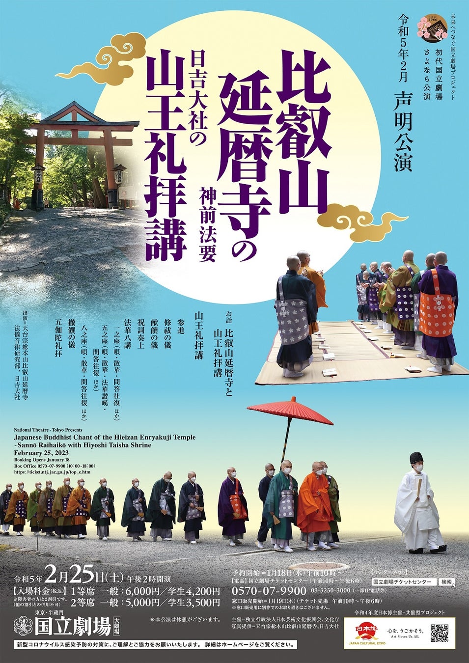 初代国立劇場さよなら公演の一つである、令和5年2月声明公演では、年に1度、比叡山の麓にある日吉大社の神前で『法華八講(ほっけはっこう)』の法要を行う、「山王礼拝講(さんのうらいはいこう)」を初上演いたします。