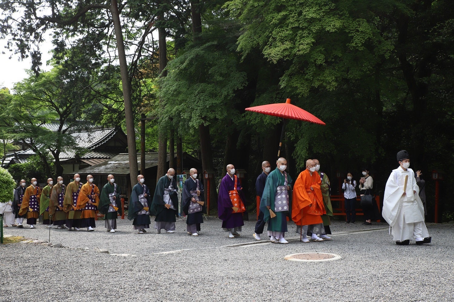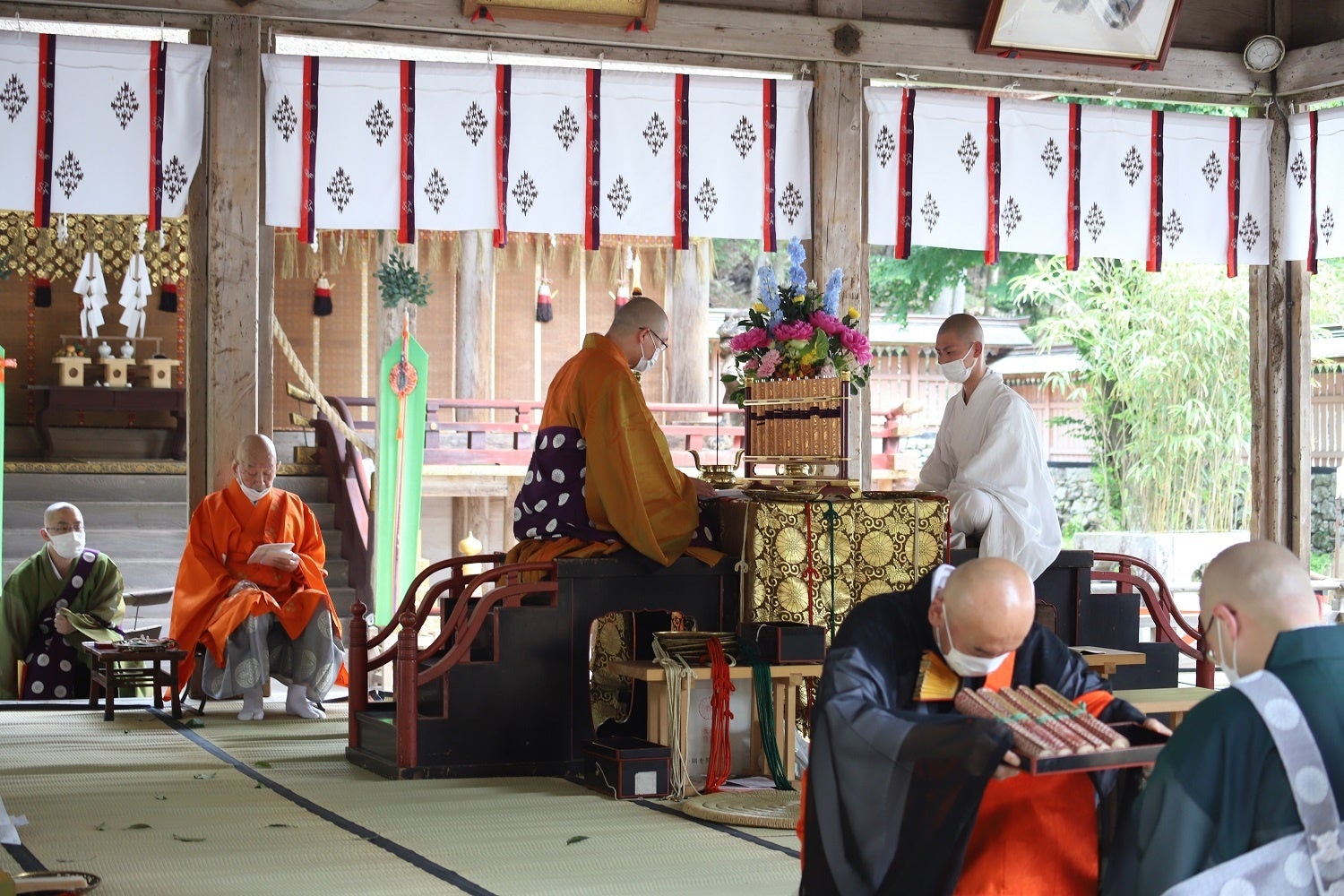 大きな見どころの一つは、法要には比叡山の僧侶だけではなく、日吉大社の神職も参加するというところです。僧侶の先導や、神前での法要を執り行うための準備をし、法要中も見守っています。