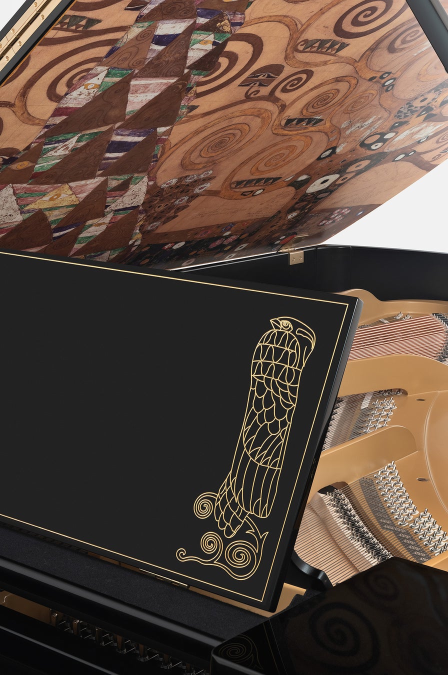 クリムトの壮大な芸術作品から着想を得て「生命の樹」と「期待」の原画を精巧な複製技術によってピアノの屋根の内側にあしらっています。「期待」に描かれた女性の装飾具の部分は、23金の金箔が一枚一枚丁寧に手作業で施され、細部まで繊細に施された金箔の装飾が、複雑な模様を一層鮮やかに際立たせています。側板の内側は美しいマットブラック仕上げで、金色に輝くフレームと相まってピアノの内側から優美な輝きを放ちます。
