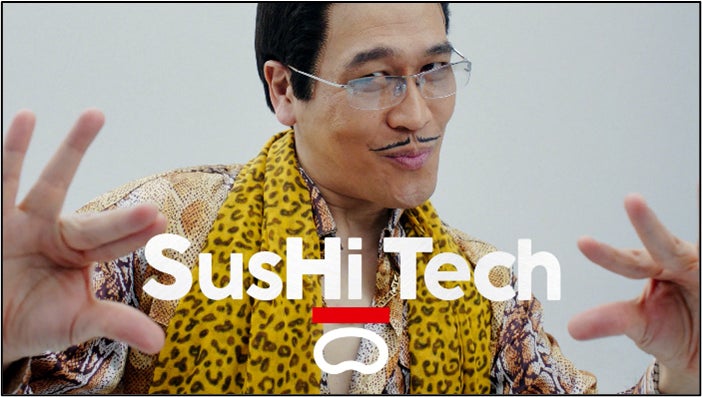 光に包まれたピコ太郎さんが登場。「SusHi Tech Tokyo」のワードを背に、一心不乱に踊ります。お馴染みのPPAPの音楽に合わせ、「I have [Sustainable] I have [High tech] んーっ!Sushi Tech」と歌います。