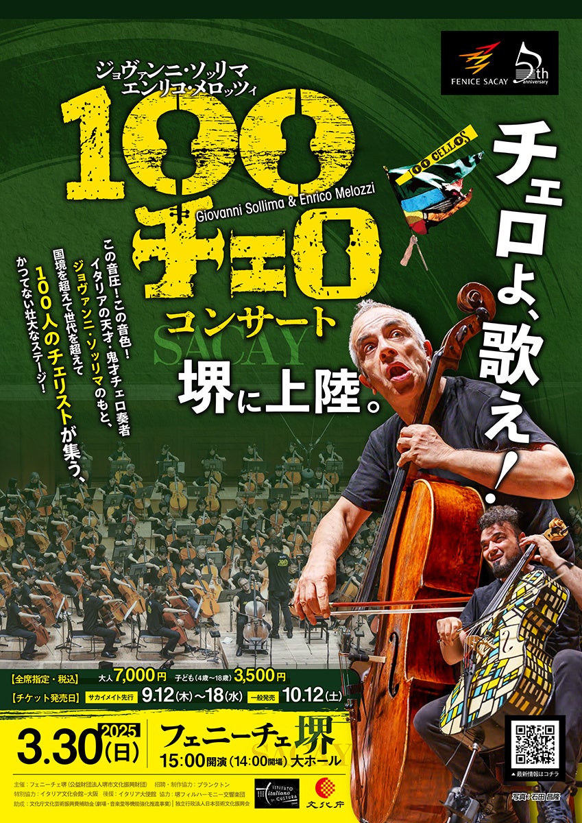 この度フェニーチェ堺(指定管理者:公益財団法人堺市文化振興財団)は、開館5周年を記念して、2025年3月30日(日)に世界的な天才・鬼才チェリスト、ジョヴァンニ・ソッリマとチェリスト、エンリコ・メロッツィを中心に100名のチェリストを一堂に集めた「100チェロ・コンサート」を関西初開催します。