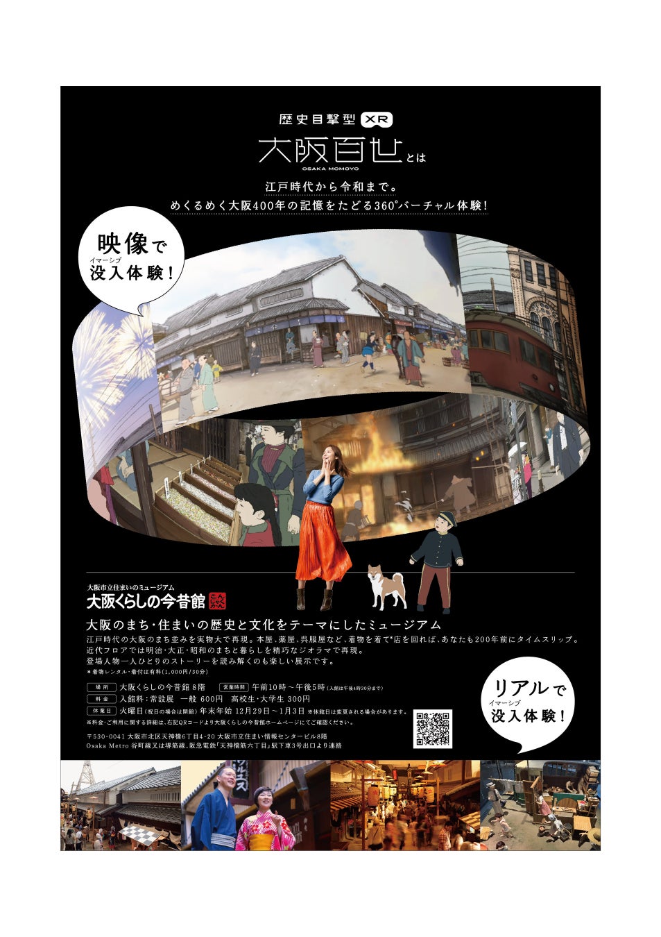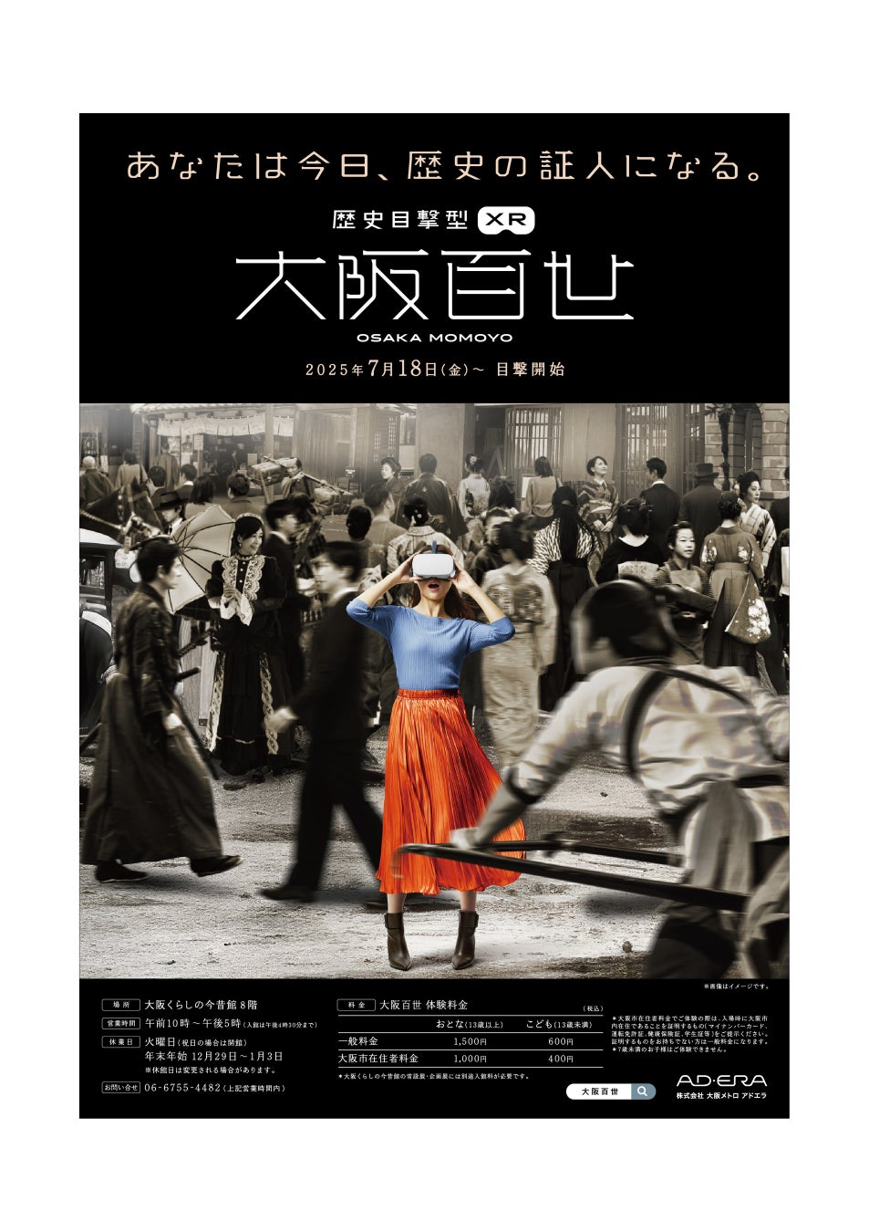 株式会社 大阪メトロ アドエラ(代表取締役社長:大矢 雅士)は、大阪の「住まい」を中心に「暮らし」や「まちづくり」をテーマとする歴史ミュージアム大阪市立住まいのミュージアム「大阪くらしの今昔館」(以降、今昔館)に於いて、XR(クロスリアリティ)を活用し大阪400年の歴史を学び楽しむことができるXR体験コンテンツ「大阪百世(おおさかももよ)」(以降、本コンテンツ) のサービスを、2025年7月18日(金)から開始いたします。