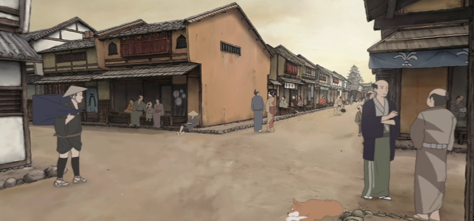 • 大坂夏の陣から50年が経過し、復興した町は賑わいを見せている。再建された大坂城も遠くに見える。