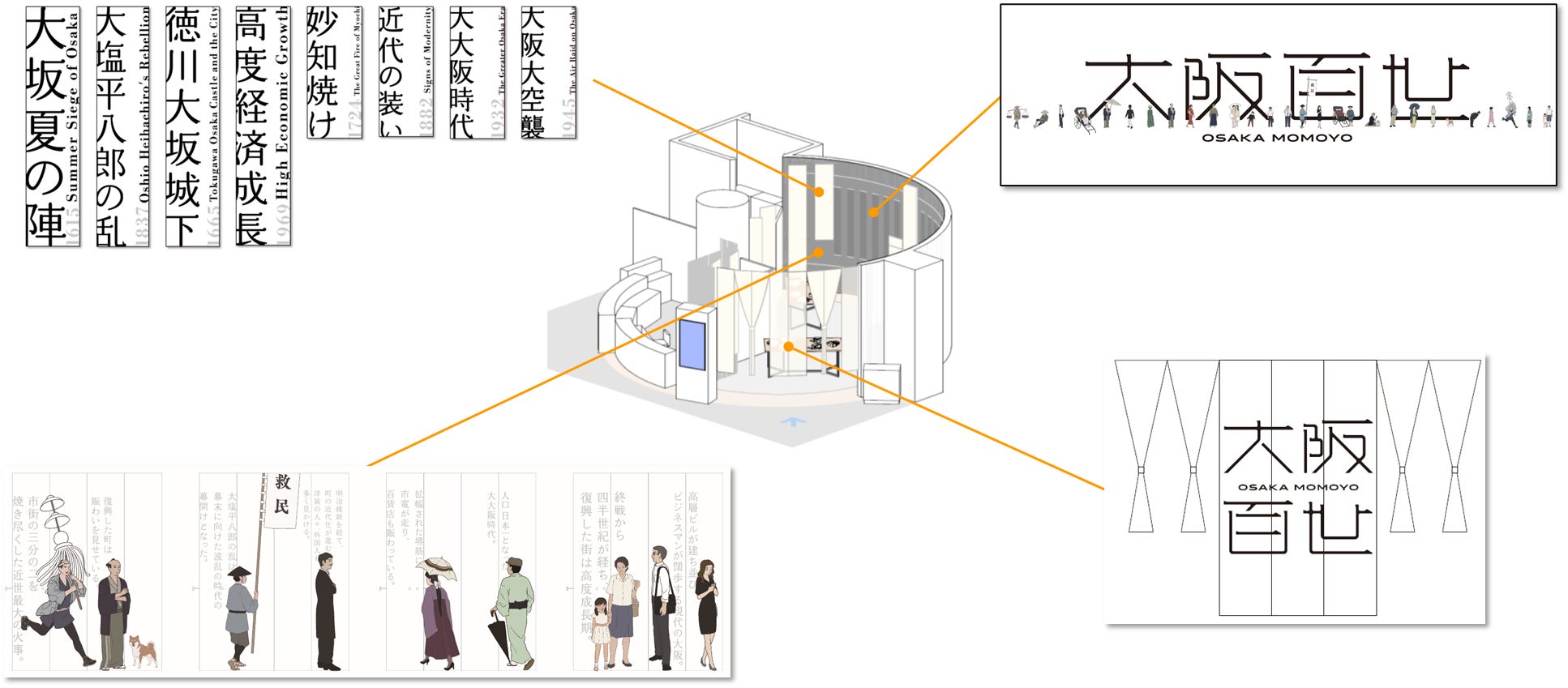 大阪百世は、400年以上にわたる大阪の歴史の世界に入り込んで、ジェットコースターのように時代のうねりを体験いただける作品です。作品の舞台は全て同じ場所ですが、時代は移り変わっていき、登場人物も時代ごとに変わっていきます。