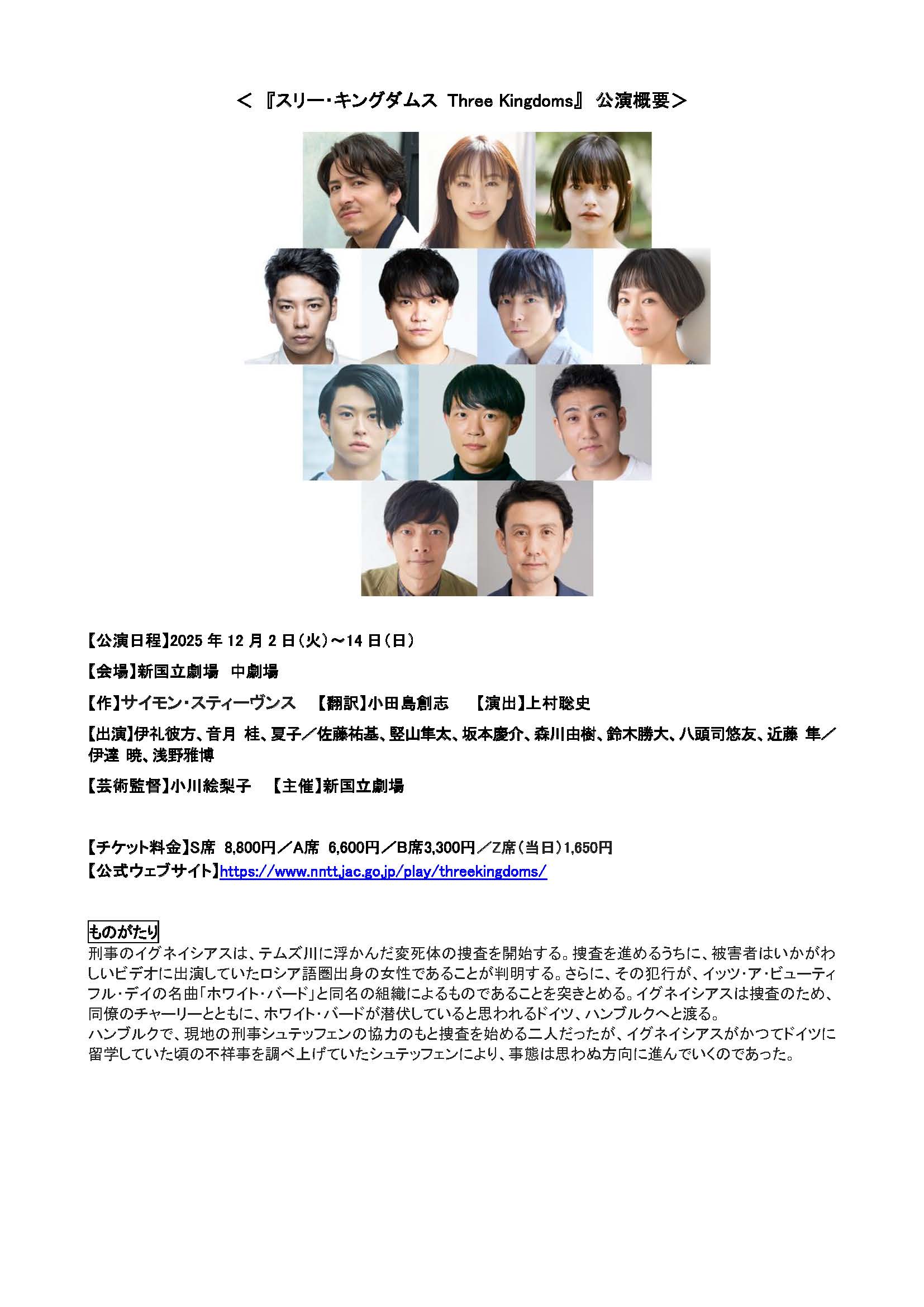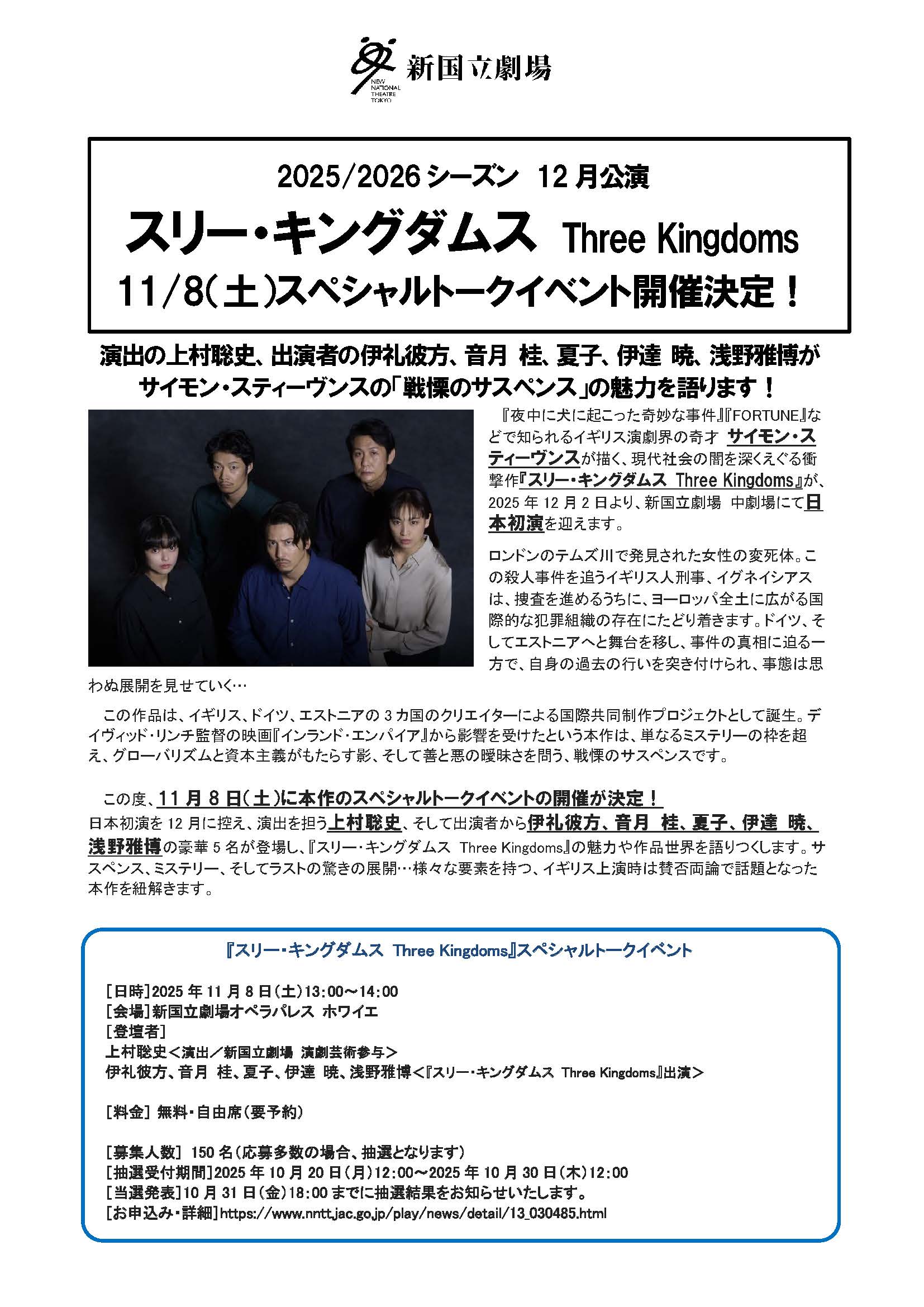【 新国立劇場 】スリー・キングダムス Three Kingdoms 11/8(土)スペシャルトークイベント開催決定...